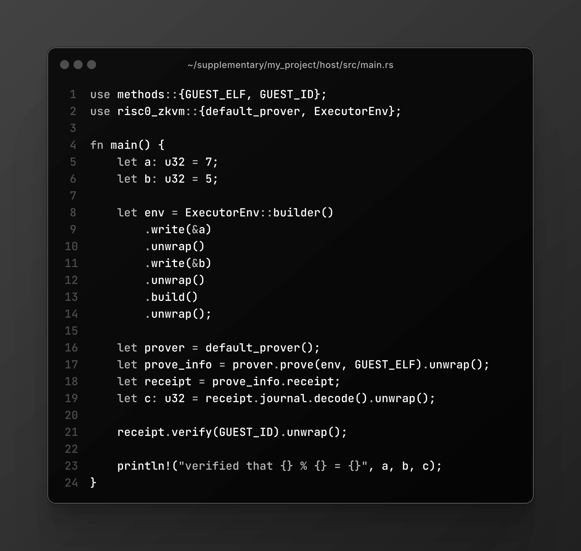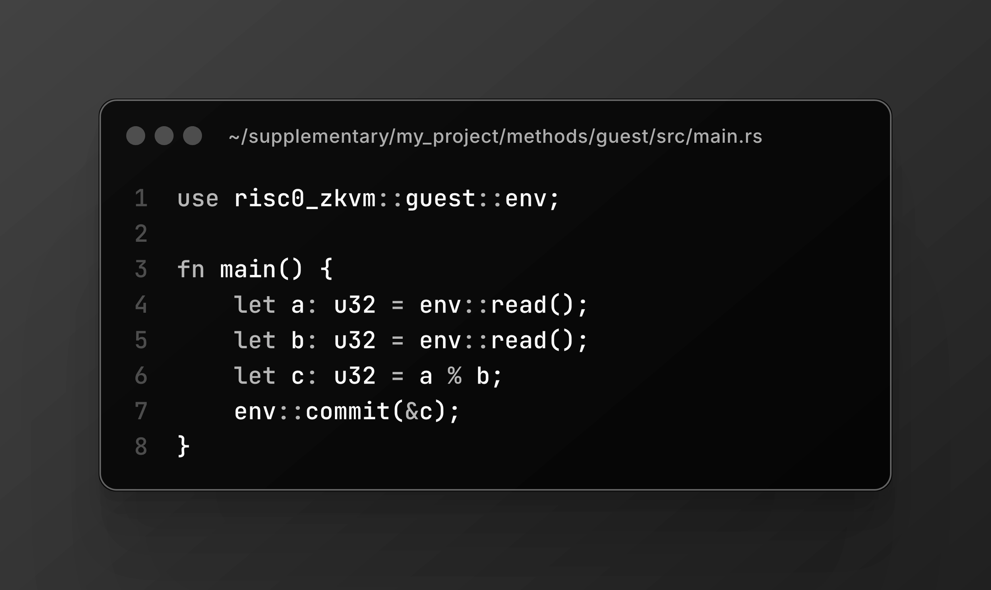 - A guest program runs inside the zkVM, doing a simple remainder operation (